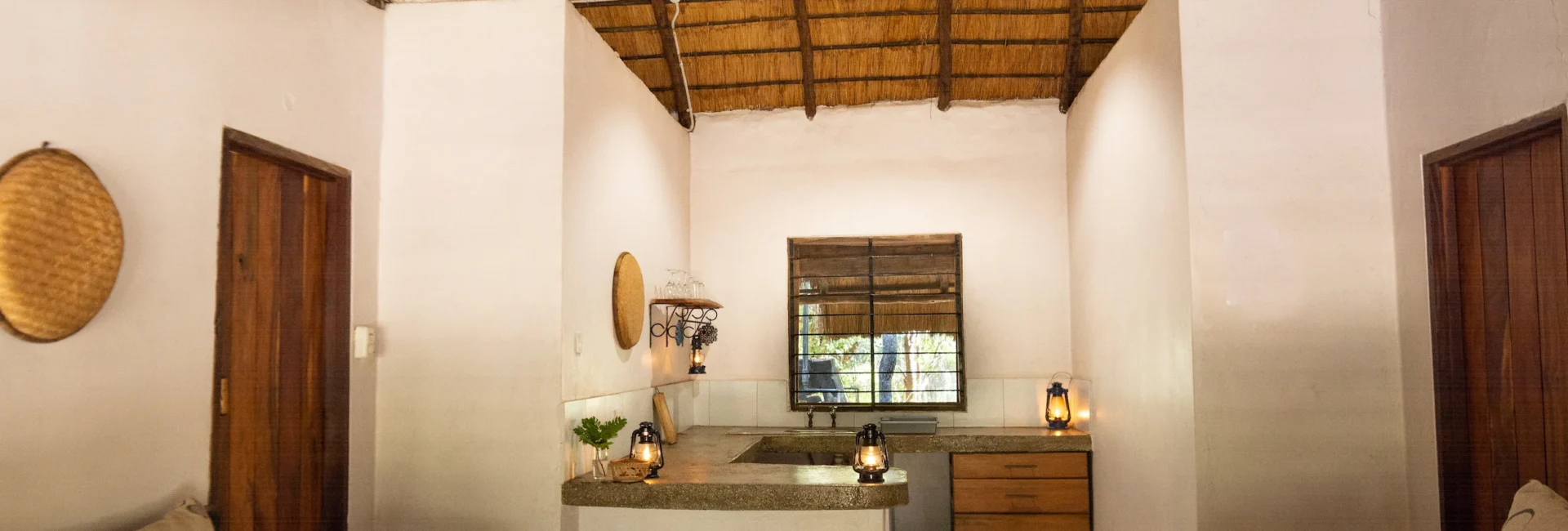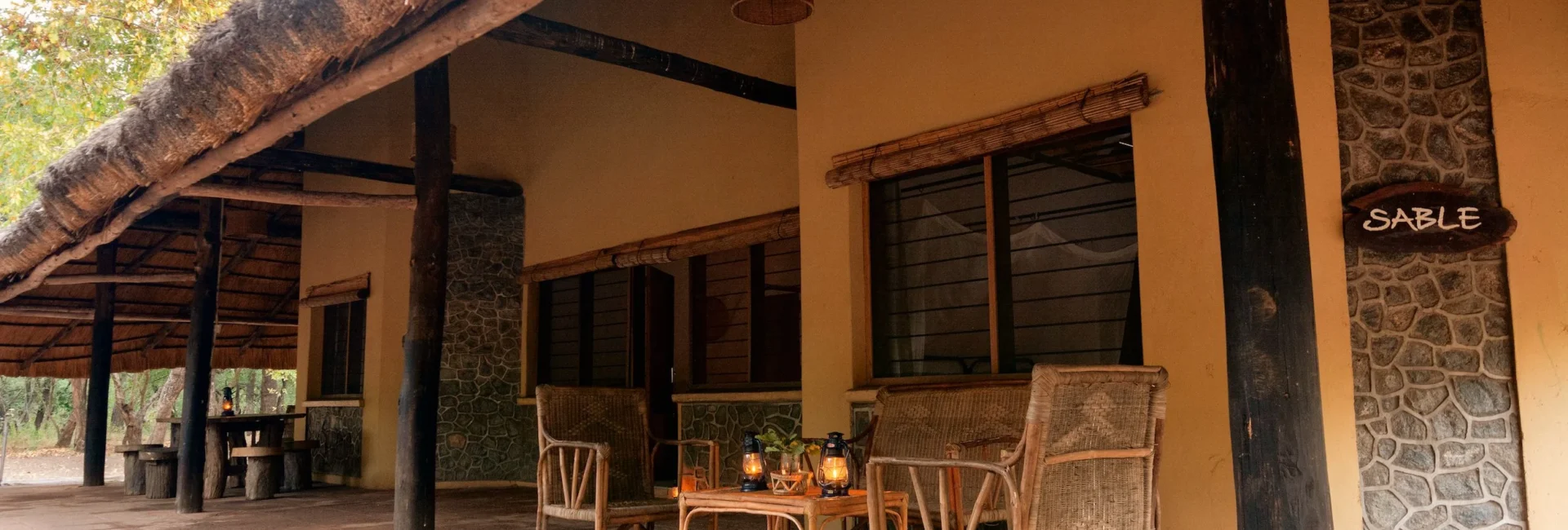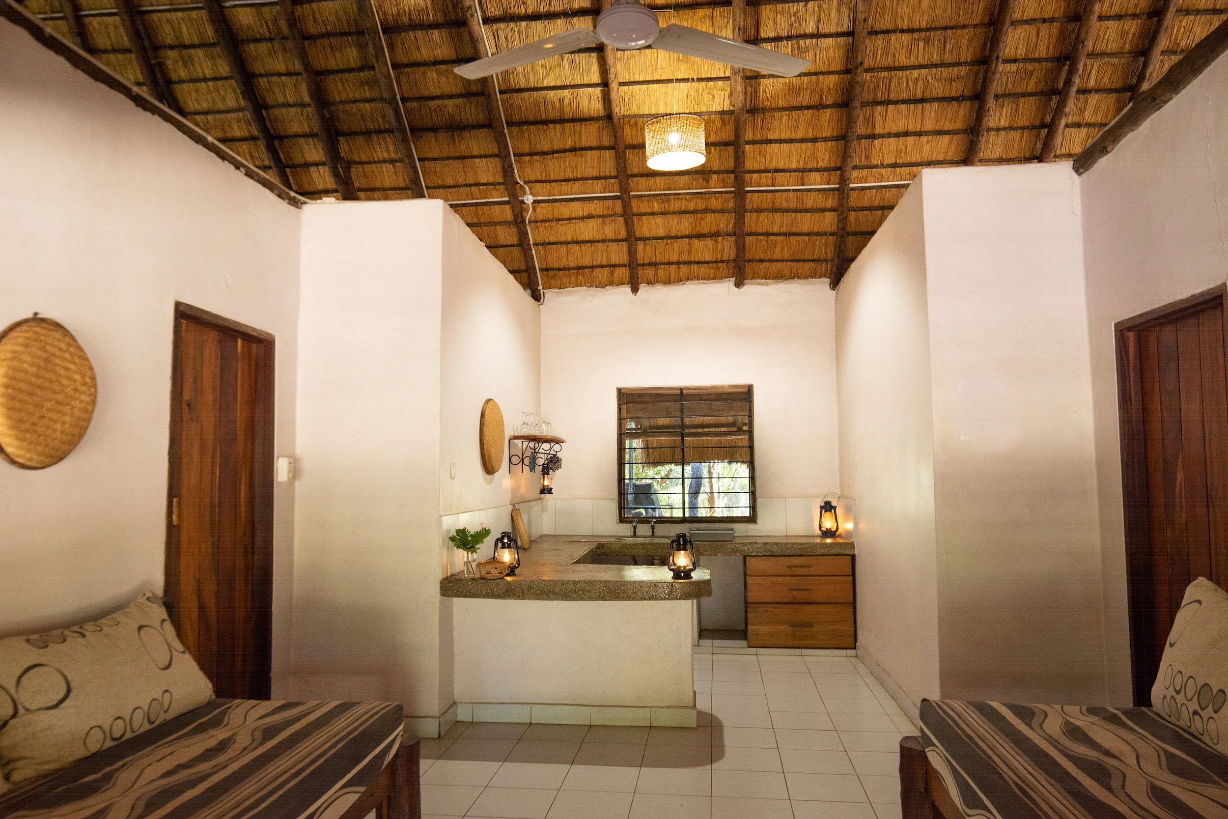 Our large bush villas (the ‘Kudu’ and ‘Sable’) are nestled in the middle of the bush. Enjoy the quiet of the forest from your private terrace. Light a cosy camp fire or have a cookout on your braai stand (barbecue). The villas have two twin bedrooms with en-suite bathrooms, a kitchenette equipped with basic supplies, and a spacious lounge area. Bed 5 and 6 are large couches in the living room and therefor more suitable for kids. From the villa it is a 15 to 20 minute walk to the reception and restaurant.