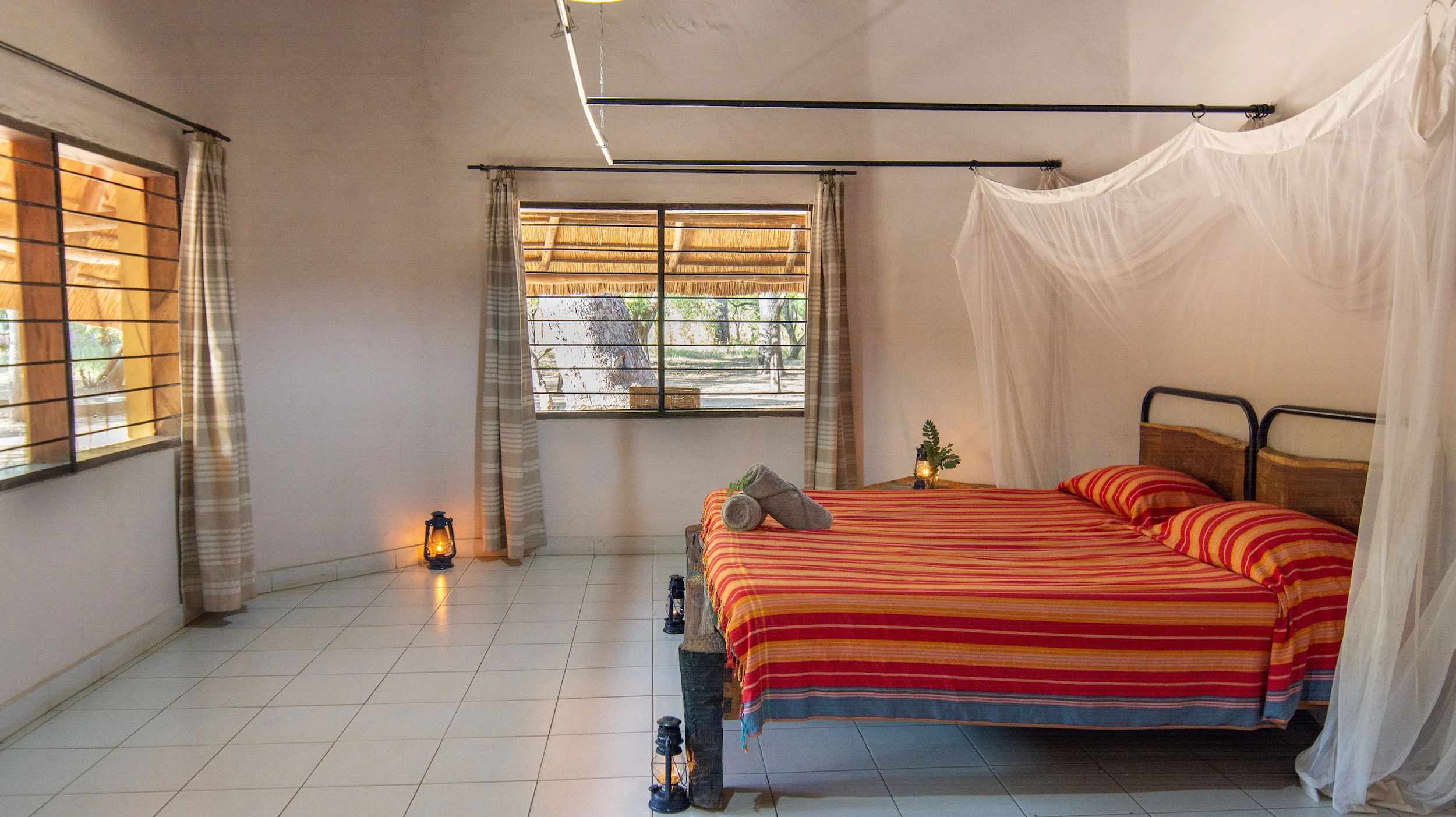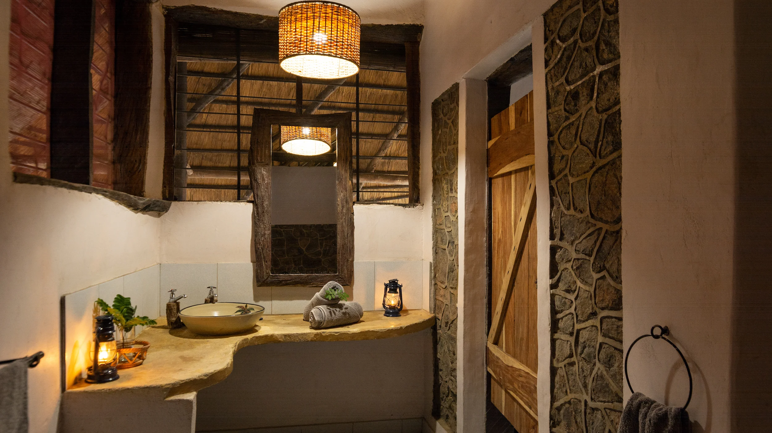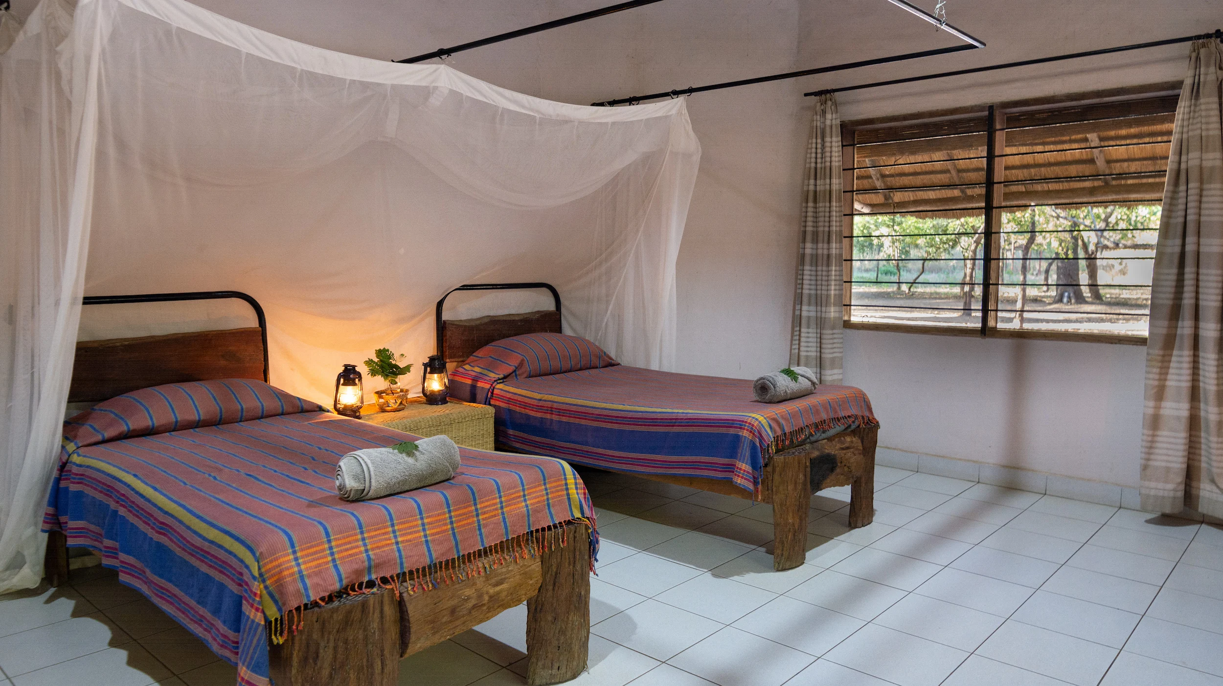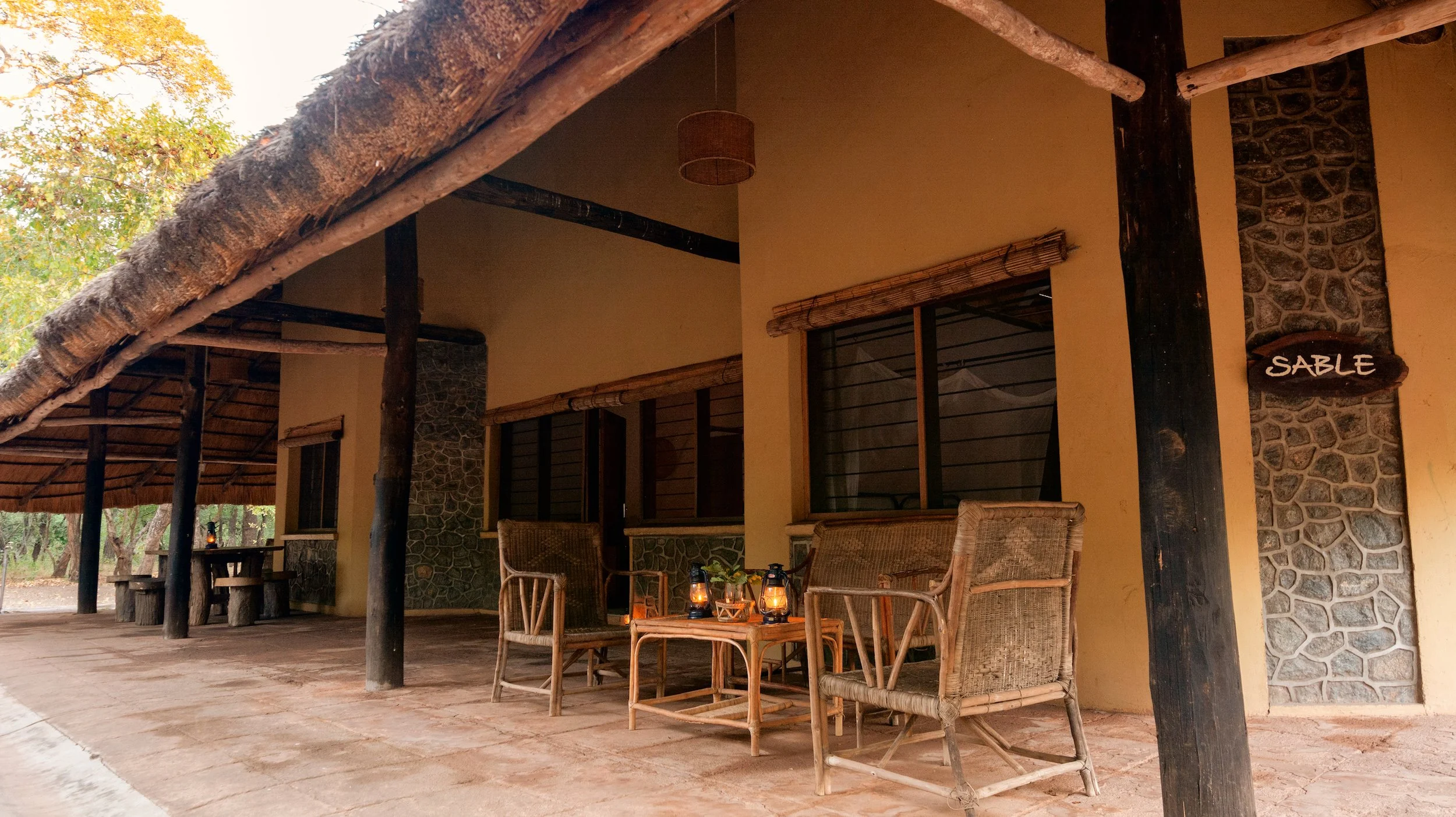 Our large bush villas (the ‘Kudu’ and ‘Sable’) are nestled in the middle of the bush. Enjoy the quiet of the forest from your private terrace. Light a cosy camp fire or have a cookout on your braai stand (barbecue). The villas have two twin bedrooms with en-suite bathrooms, a kitchenette equipped with basic supplies, and a spacious lounge area. Bed 5 and 6 are large couches in the living room and therefor more suitable for kids. From the villa it is a 15 to 20 minute walk to the reception and restaurant.
